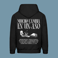 hoodie color negro con estampado de 'mucho cambia en un año' al frente, y estampado cinemático del tracklist al reverso.